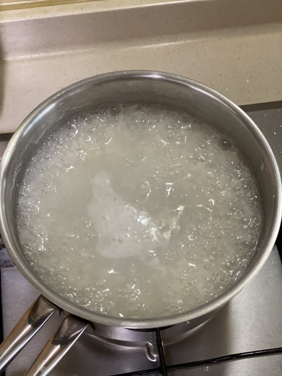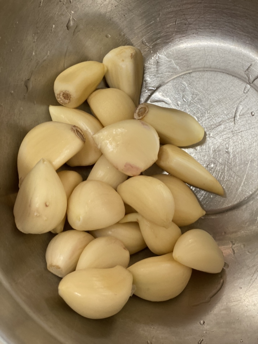 6. 풀이 다 쑤어졌으면 찬물에 담가 식히고 마늘도 준비해주세요. (약 20개)