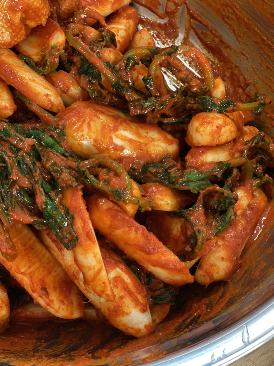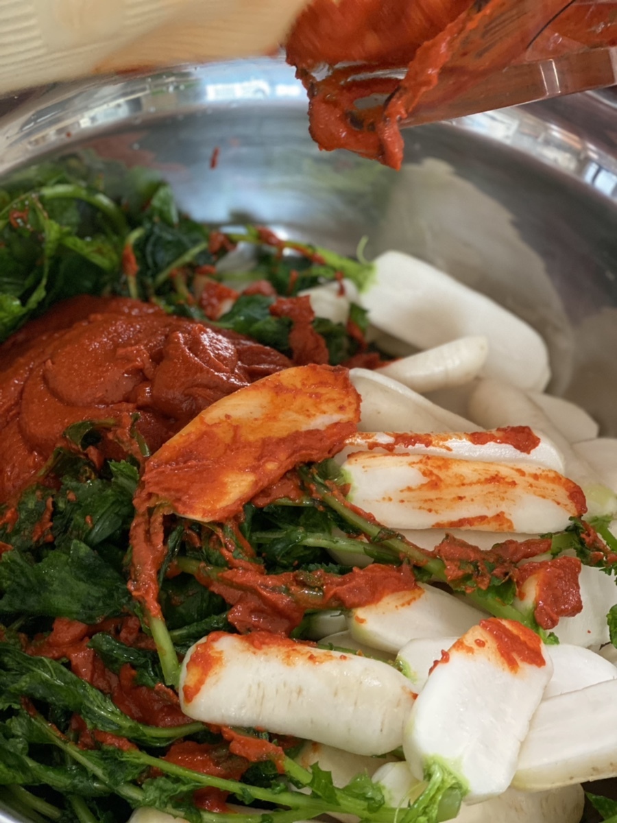 엄마가 고추가루까지 믹서에 넣고 가는 바람에 뭔가 떡볶이 비주얼 양념이 됐지만, 맛은 훌륭한 총각김치가 되었습니다.