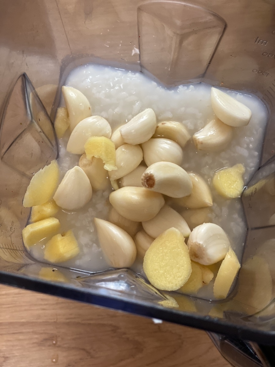 7. 요즘에 사과가 제철이니 단맛을 위해 사과 하나(또는 배 하나), 마늘(약20톨), 생강(엄지손톱 2개만한 사이즈 하나), 새우젓 반컵, 완전히 식힌 찹쌀풀 2컵을 넣고 갈아줍니다.