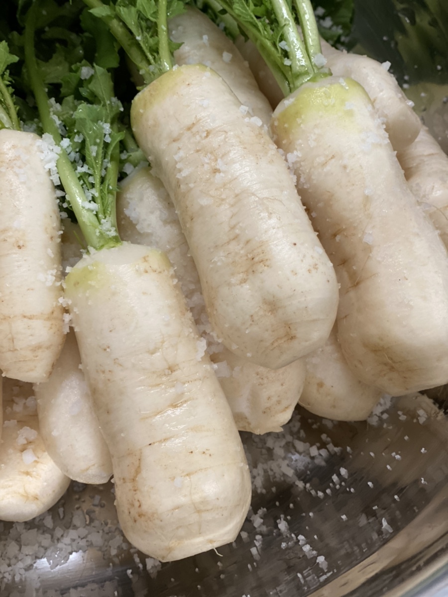 3. 손질한 알타리무는 깨끗이 한번 씻고 무 부분에만 소금을 뿌려 절여주세요. 소금양은 ‘무에 소금이 골고루 묻었구나~’ 하는 정도면 됩니다.