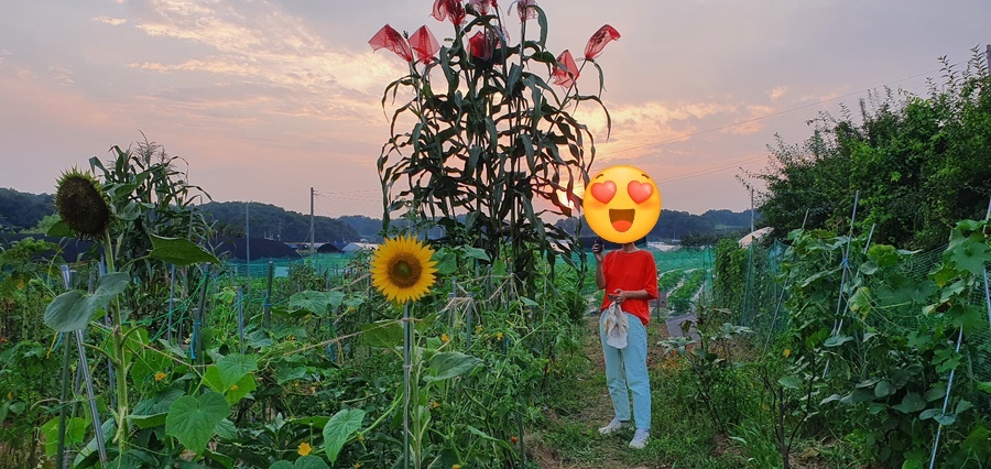 더 크지는 않고 다 익어보이는 내 작은 토종 가지를 첫수확해 현주언니와 한개씩 나누었다. 언니가 카메라를 들이밀길래 ‘나를 왜 찍어주나? 그것도 왜그렇게 멀리까지 가서 찍어주나?’ 궁금했더니만 키가 엄청나게 큰 원순님 수수를 내 키로 가늠하려고 찍었단다. 허허 배신감~~ ㅎㅎ